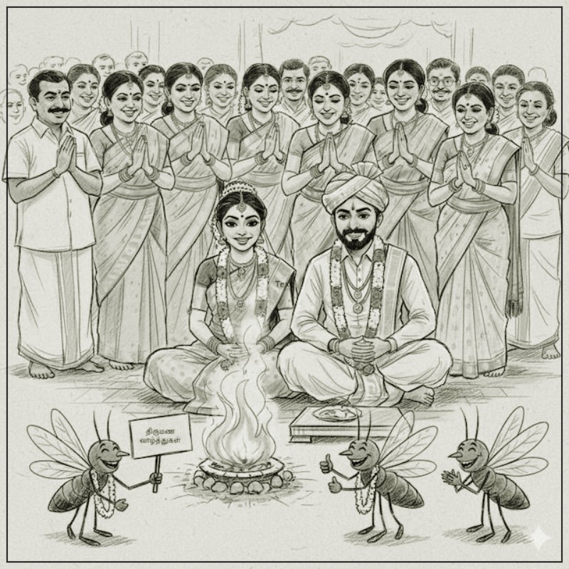 ‘கொசு மங்கல யோக ஜாதகம்! கோடில ரெண்டு பேருக்குத்தான் இப்படி அமையும்.’ ‘ஜோசியரே, உருட்டாதீங்க!’ ‘தம்பி, வெறும் ஜாதகத்தைப் பாத்து மட்டும் சொல்லல. எனக்குத் தெரிஞ்ச பலவிதமான மந்திர தந்திர டெக்னிக்கலாம் வச்சு சொல்றேன். உனக்கு கல்யாணம் ஆகணும்னா அது கொசுவாலதான் நடக்கும்...